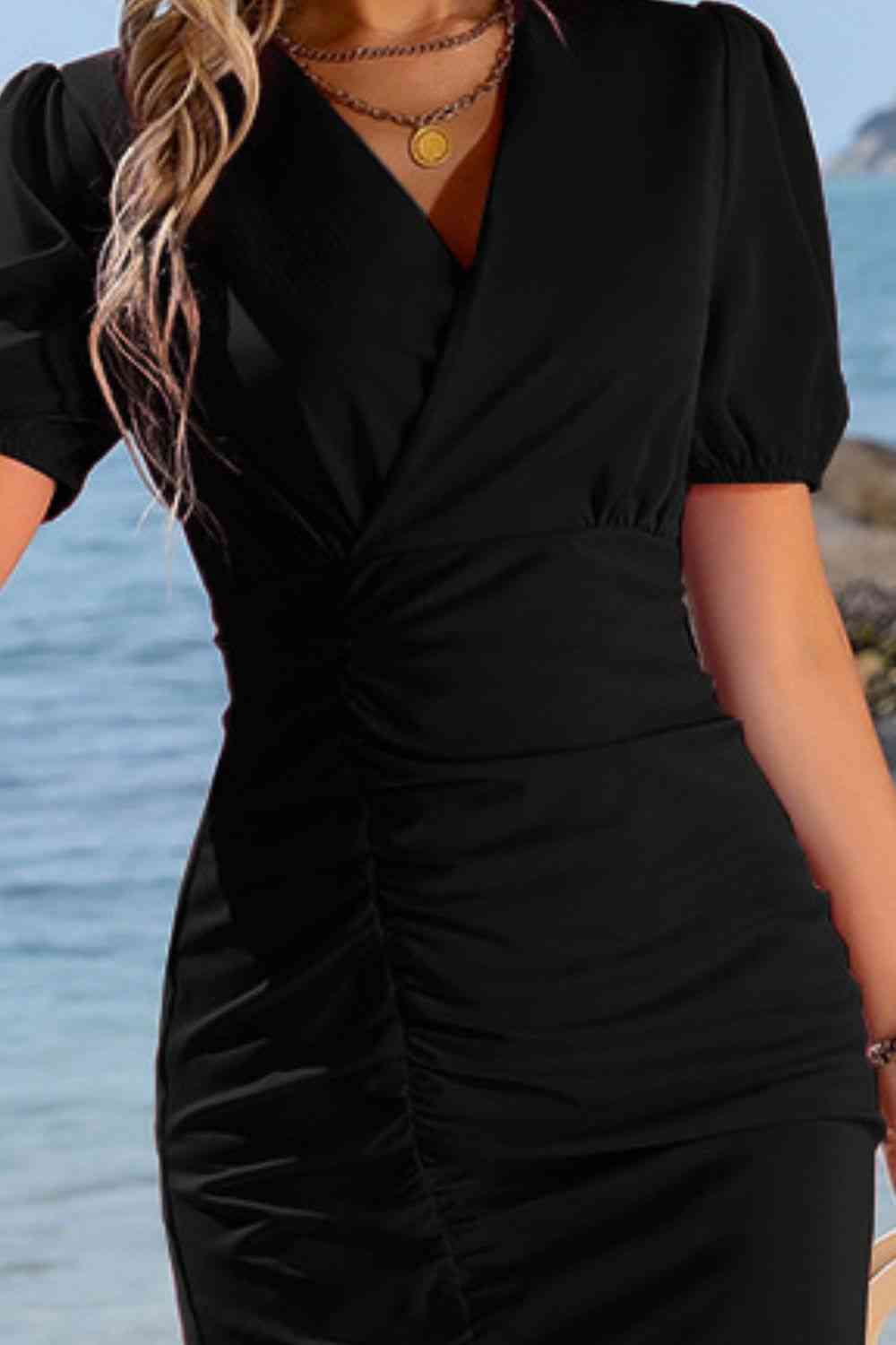 Surplice Neck Ruched Puff Sleeve Dress